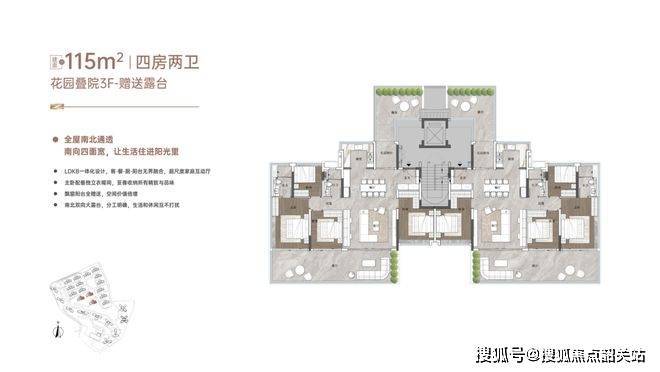 这是最接近墅级形态的户型,下层做了侧花园设计,顶层的天面露台全赠送,实现了约242%的使用率。