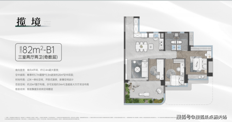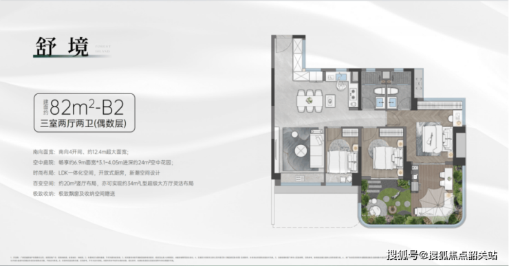 82㎡三房两厅两卫:单露台设计,实用面积约105-110㎡,实用率约128%起,总价约230万起。