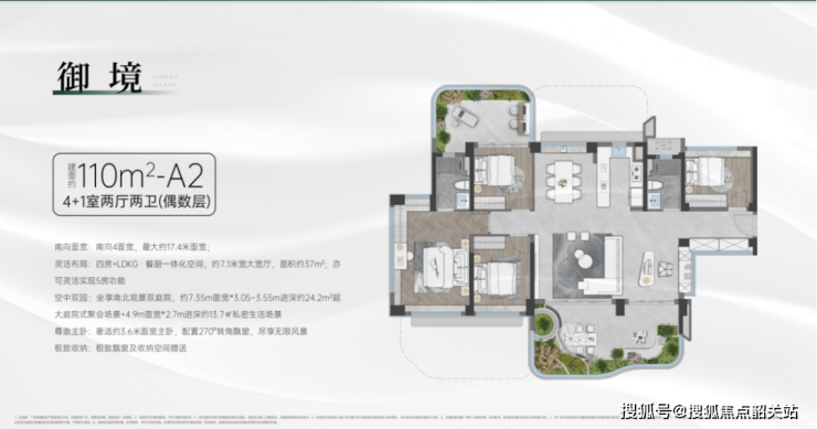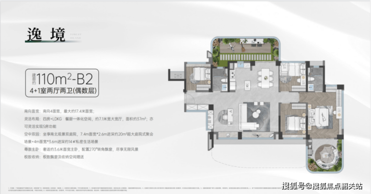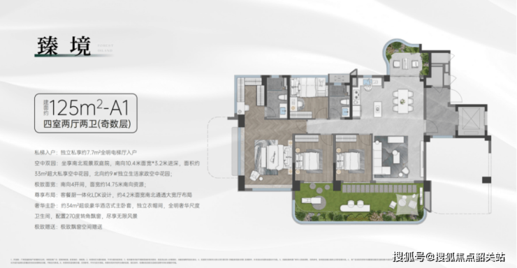 125㎡四房两厅两卫:双露台+南北双庭院设计,实用面积约176-177㎡,实用率140.8%起,总价约400万起。