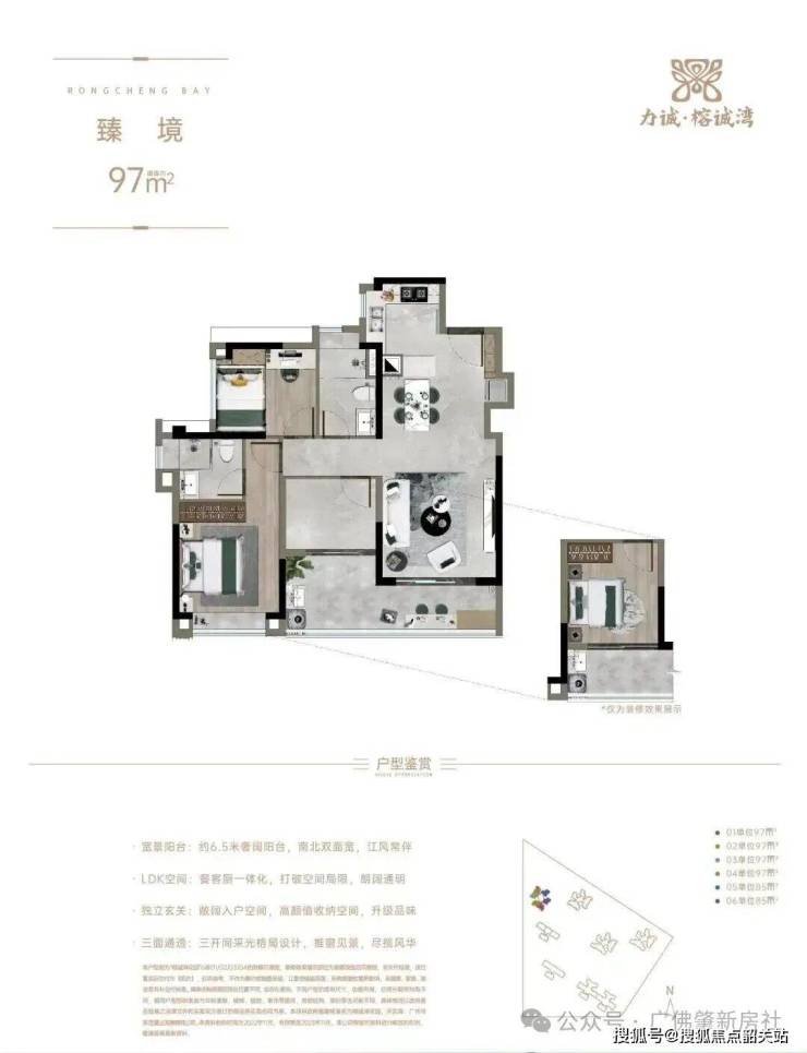 建面约97㎡,江园双景臻席,不仅能欣赏花地湾江面卓绝风光,还能俯瞰榕诚公园,以及GVL怡境国际匠心打造的“山林麓畔 隐翠森居”主题大师园林,LDK餐客厨一体设计,约6.5米宽境阳台。
