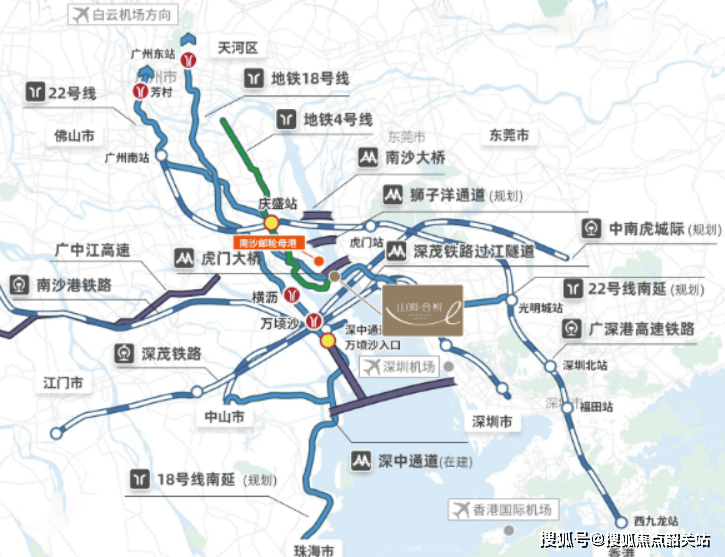 地铁线路:距离4号线、15号线(规划中)、22号线(南连莞深)交汇的南沙客运港站仅900米,未来将实现30分钟直达广州中心。