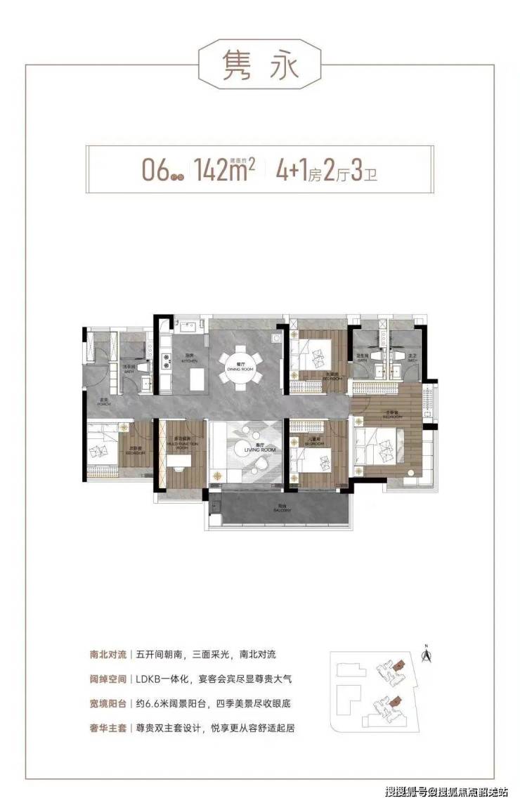 142㎡五房三卫:双主卧套房,7.2米景观阳台,满足三代同堂需求。
