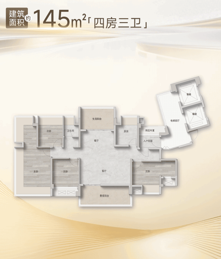 建面约 144㎡四房户型,采用 3T3 专梯专户设计,私梯入户保障极致的居住私密性,层高提升至 3.15 米,打造双套房居住格局,主卧套房与老人房分置户型两侧,三代同堂居住也能实现互不打扰,同时配备宽幕观景阳台,部分高楼层户型可俯瞰珠江江景,匹配高端改善客群的居住需求。
