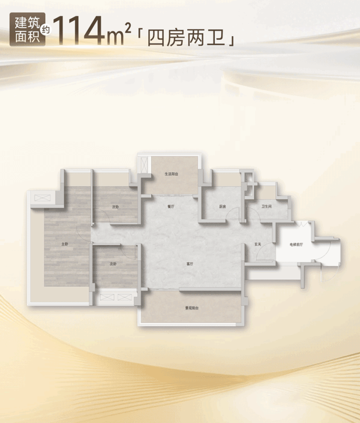 建面约 114㎡四房户型,采用 2T4 梯户比设计,层高 3.05 米,配备独立入户花园与南北双阳台,实现南北通透的全明居住效果,户型内预留 X 自定义空间,可根据家庭需求灵活改造为书房、儿童房、储物间、健身区等功能空间,适配家庭不同成长阶段的居住需求。