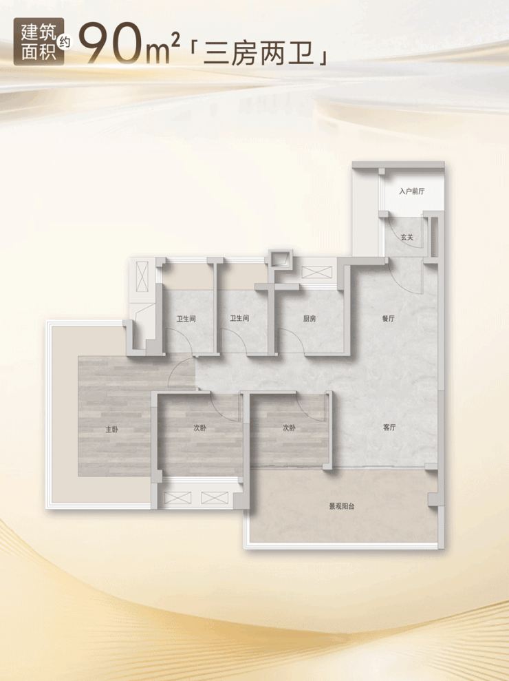 建面约 90㎡三房两卫户型,层高 3.05 米,配备独立入户花园,LDK 客餐厨一体化设计搭配双面宽观景阳台,空间布局方正无浪费,在控制总价的同时,实现了功能齐全的三房两卫格局,完美适配首次置业家庭的居住需求,兼顾实用性与舒适度。