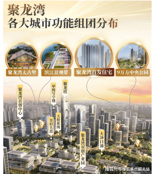 聚龙湾片区规划打造集顶奢商业、超甲级写字楼、总部经济中心、高端住宅、文化休闲、滨水生态于一体的城市中央活力区(CAZ),与珠江新城 CBD、琶洲 CTD 形成三足鼎立的广州城市发展格局,共同构建广州国际大都市的核心功能骨架。