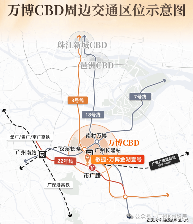 项目直线距离地铁 22 号线市广路站仅约 800 米,步行即可快速抵达地铁站,实现与广州核心轨交网络的无缝衔接。地铁 22 号线是广州首条时速 160 公里的高速地铁,与 18 号线同规格建设,是广州南部贯通南北的交通大动脉,目前线路已全线开通运营,从市广路站出发,1 站即可抵达番禺广场、广州南站,2 站直达万博中心,3 站抵达琶洲 CBD,4 站即可抵达珠江新城,6 站通达白鹅潭商务区,能够快速覆盖广州核心就业中心与商圈。