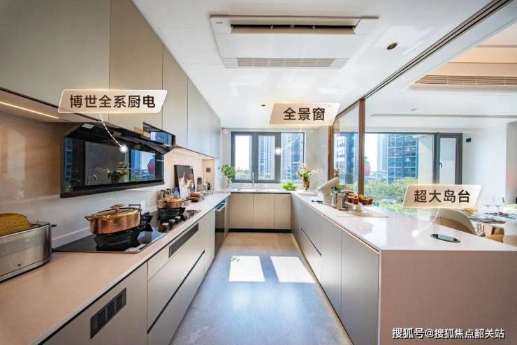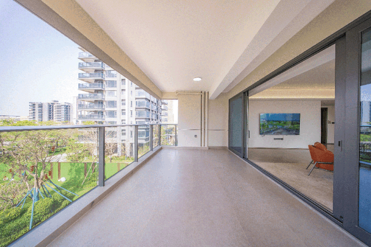 以主力户型建面约241平方米的四房设计为例,该户型采用了LDKBG(客厅、餐厅、厨房、阳台、书房)一体化布局,公共活动区域面积总计约100平方米。进门即见约7.2米开间的阔绰横厅,连接着进深约3.4米的超大景观露台,形成了一个无界的空间场域。厨房设计为U型景观厨房,操作台面长度超过6米,并预留了嵌入式洗碗机、蒸烤箱等高端厨电的位置,窗户正对江景与园区景观,让烹饪过程不再封闭枯燥。卧室区域采用了“双套房”设计,主卧与长辈房分别位于户型两侧,互不干扰。主卧内部配置了独立衣帽间、双人台盆卫浴及浴缸,面积约35平方米,具备酒店行政套房的舒适度。若家庭结构发生变化,该户型还可灵活调整为三房模式,释放出更宽敞的公共活动空间,适应不同人生阶段的居住需求。