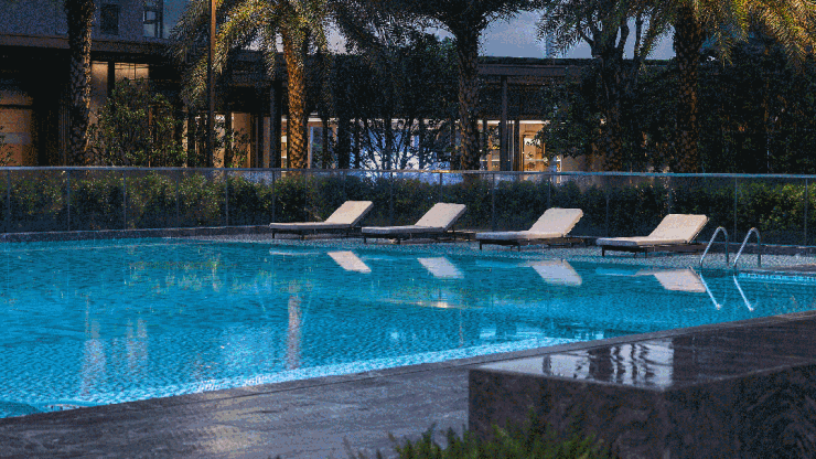 社区内部园林由五大主题酒店式景观组成,中央草坪面积约2000平方米,配备了遮阳廊架与休憩座椅,是业主日常散步、亲子活动的核心区域。架空层被打造为艺术大堂与泛会所空间,设置了儿童游乐区、四点半学堂及健身瑜伽室,满足了全龄段业主的休闲需求。值得一提的是,小区内规划了华尔道夫品牌的星空泳池,泳池水面倒映天光,夜间灯光设计柔和而不刺眼,营造出度假般的氛围。运动场地方面,项目配备了标准的夜光跑道和多功能球场,地面采用环保透水材料,确保雨天也能正常使用。这些配套设施并非简单的堆砌,而是基于对高净值人群生活方式的深入调研,力求在有限的社区空间内,提供无限的生活场景可能。