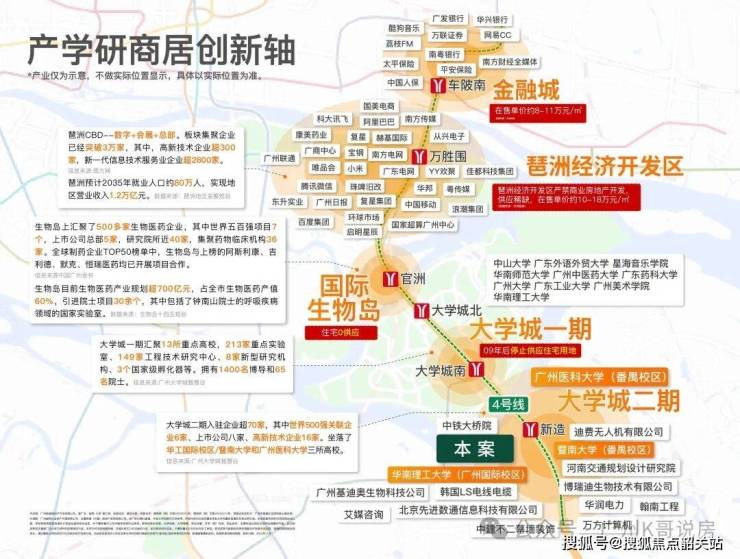 项目位于大学城二期-国际创新城板块,国际创新城共十平方公里,有暨南大学和广州医学院,整个创新城包括北翼的生物岛,核心的大学城和南翼的南岸起步区,南村地区,化龙地区,国际展贸城,在空间结构上形成了一核两翼。