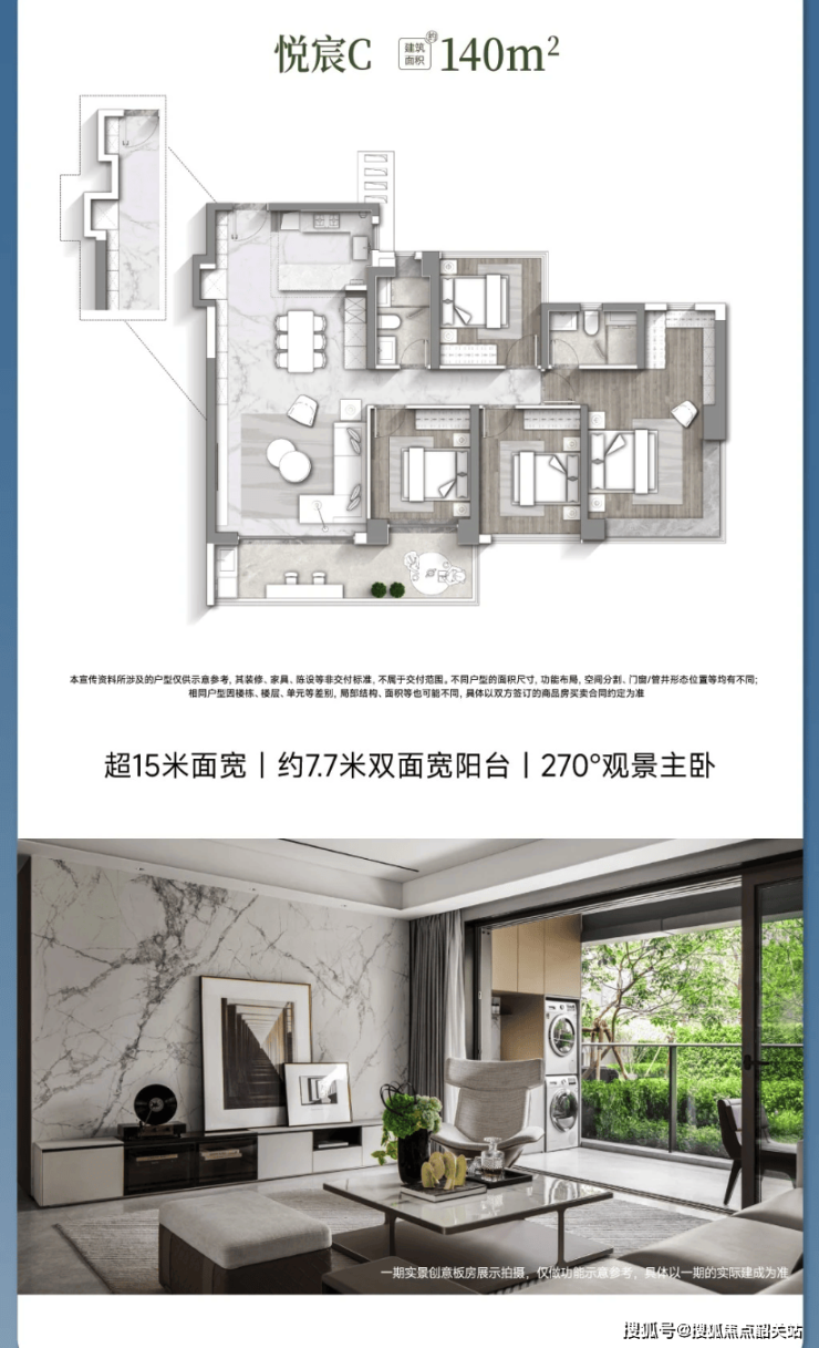 【悦宸 C 户型 建筑面积约 140㎡】:超 15 米户型展宽,四开间朝南,巨幕采光面;约 4.6 米开间客餐通厅,半开放中西厨,LDKG 舒适起居;约 7.7 米双面宽阔景阳台;南北对流主卧,三面窗 270° 采光,全景天幕视野。