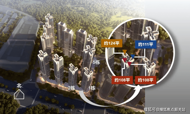 二期推出建面约 108 - 111 - 124 平全南向纯四房,相比一期,房间数从三房进化成四房,主卧飘窗从南北对流双飘窗升级为 270°U 型无遮挡柱的全画幅飘窗(天空之境),观景效果震撼,从房间里往外看是沉浸式全画幅观景视角。具体户型如下: