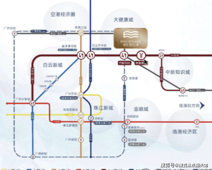 项目虽不处于传统意义上的“双城枢纽”,却凭借轨交优势,成为连接白云新城与知识城的“过渡型主场”。通过14号线5站直达嘉禾望岗,进而快速抵达白云新城,享受万达广场、凯德广场等商业繁华;借助花莞高速等路网,可便捷通达知识城,承接其产业外溢的居住需求。