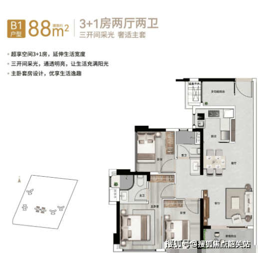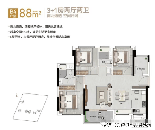 2. 88㎡横厅户型:采用阔绰横厅格局,南北通透,采光通风效果更佳,客厅视野开阔,空间感更强,适合喜欢大客厅、注重采光的家庭。同样是3+1房2厅2卫(带主套),灵动空间可作为书房、儿童房,实用性拉满,低总价就能享受横厅的开阔感,性价比极高。