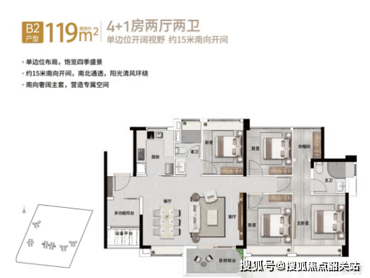 1. 119㎡横厅户型:采用单边位布局,15米南向开间,南北通透,采光通风效果极佳,客厅阔绰,视野开阔,可享受社区园林景观。主卧套房设计,南向奢阔主卧,配备独立衣帽间,私密性和舒适度拉满;4+1房的设计,比同面积户型多一个灵动空间,可作为书房、儿童房、储物间,满足家庭的多样化需求,是改善换房的首选户型。