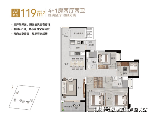 2. 119㎡竖厅户型:采用经典竖厅布局,南向通风三开间采光,空间布局合理,动静分离,日常起居便利。主卧套房设计,配备步入式衣帽间,收纳空间充足;4+1房的设计,空间利用率高,可满足多人口家庭的居住需求,低总价就能实现改善换房,性价比极高。