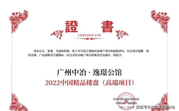 2022年7月7日,中冶 · 逸璟公馆荣获中指院“2022中国精品楼盘TOP1(高端项目)”。
