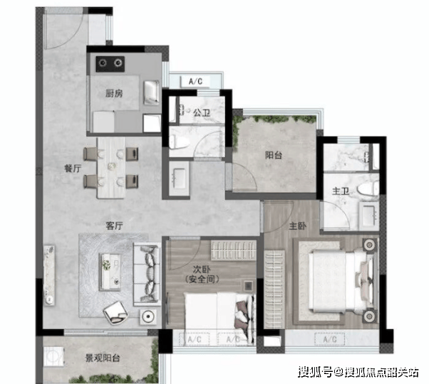 户型使用得房率约98%;全屋阳台占比约14%;