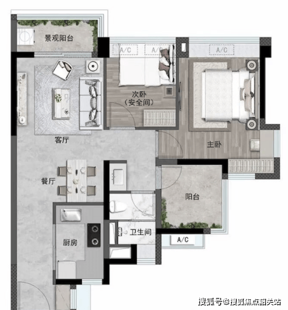 景观阳台面宽约5.5米,连接次卧;阳台面积占比约15%;