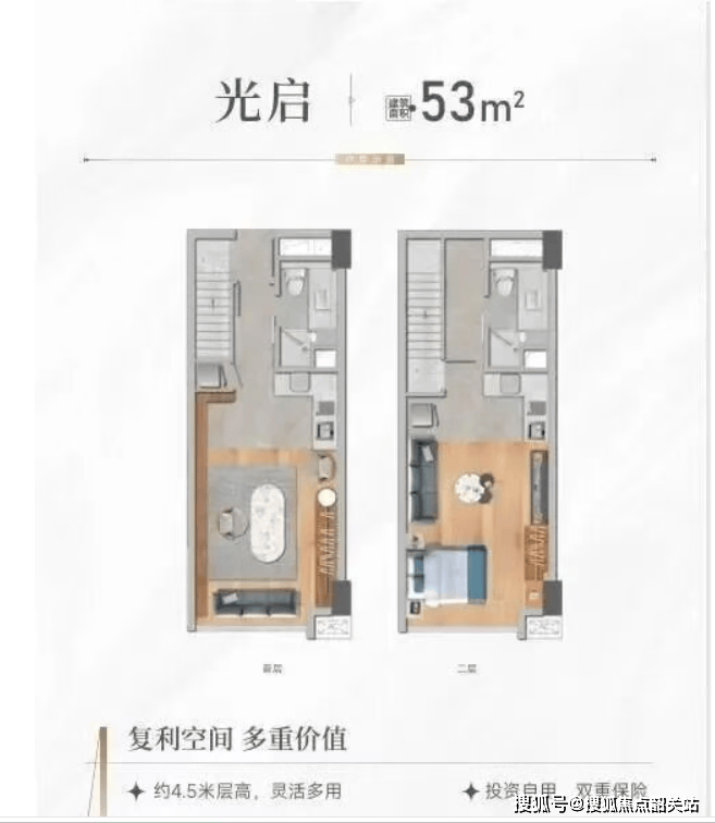 户型亮点:大开间无柱设计,布局方正紧凑,4.5 米奢阔层高,可灵活隔为两层,实现 “一层投入、双重空间”