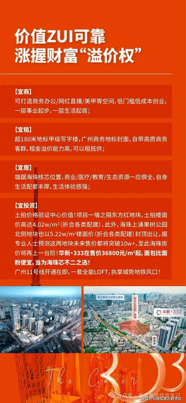 华新·333位踞海珠广纸芯,一梯直连广佛线/11号线交汇的燕岗站;以世界资产门牌号的姿态,为广州力献一座封面作品。项目由约180米甲级写字楼、超3万㎡商业MALL、封面LOFT组成,拥有海珠惟一住宅式LOFT产品,面积涵盖33-58㎡。