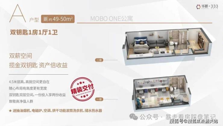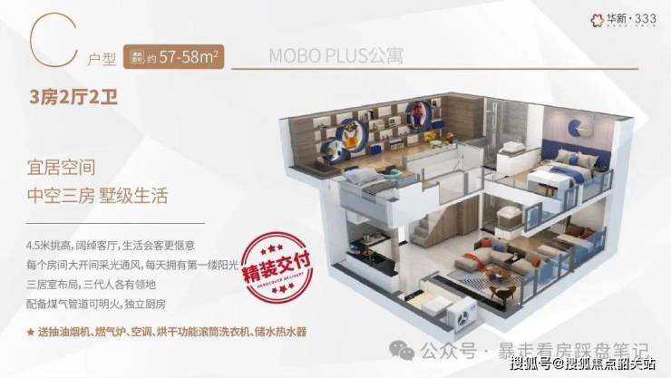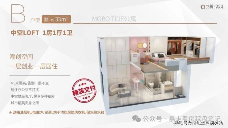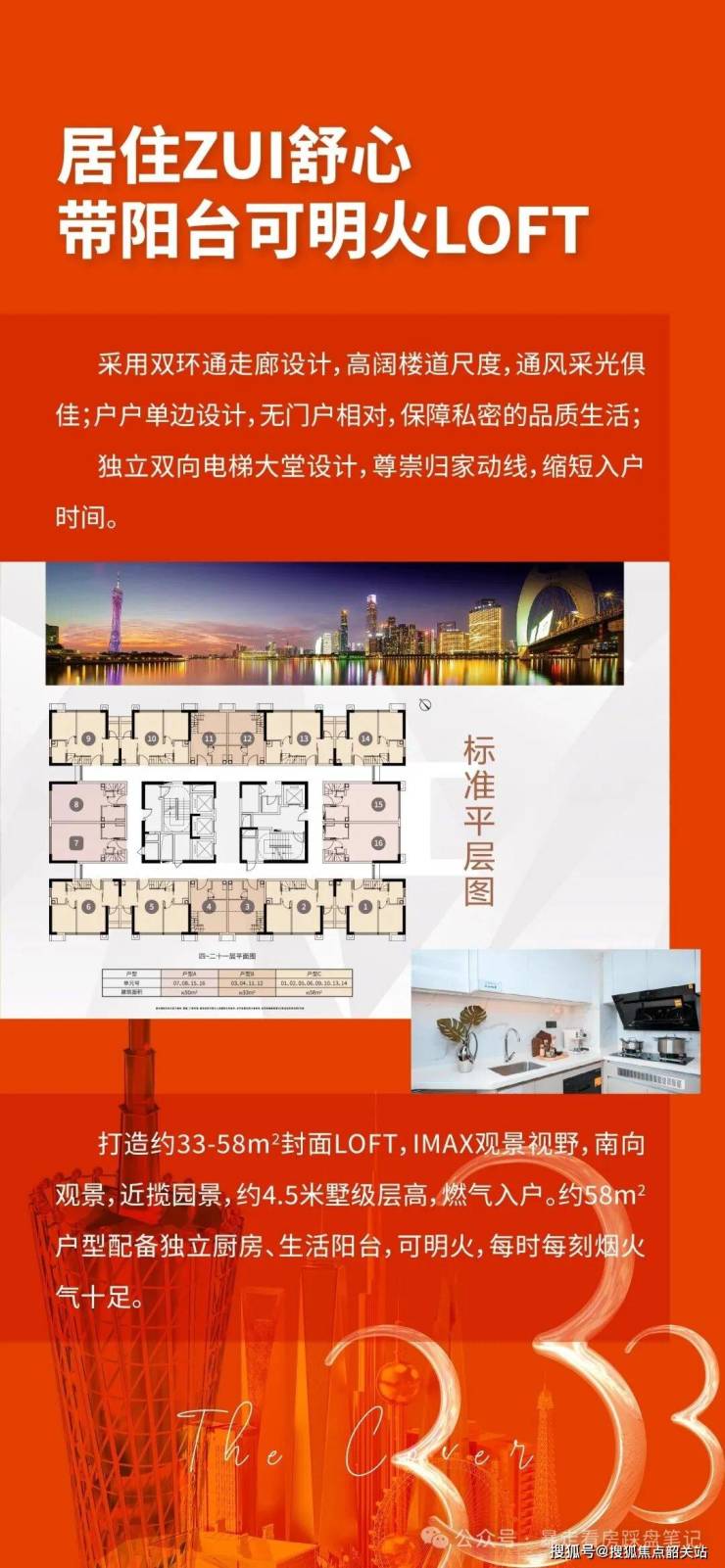 3,产品稀缺+空间实用:4.5米层高LOFT(33-58㎡),部分可明火+带阳台;双环通走廊+户户单边,通风采光/隐私好;使用率高,58㎡可做三房。。