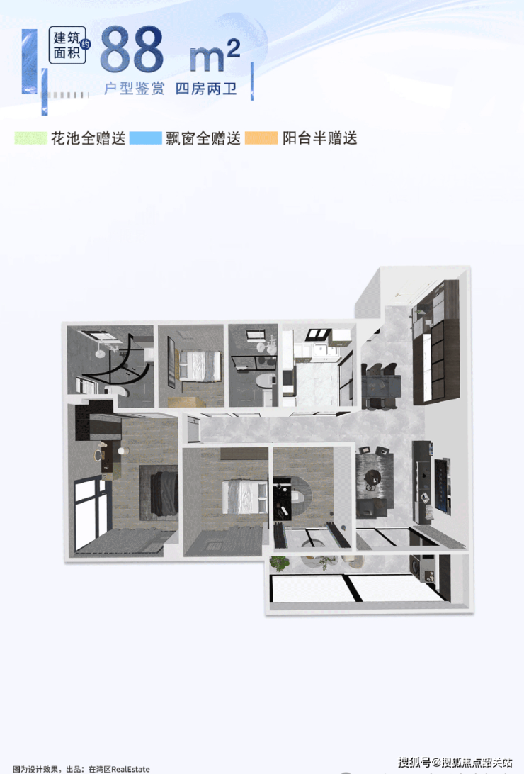 88㎡和 91㎡的四房两卫户型同样亮点十足,充分利用空间,满足家庭不同阶段的居住需求 。