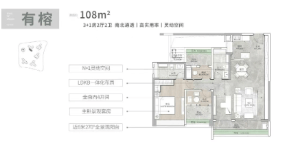 108 平 3 + 1 房:四开间朝南,近 6 米南向阳台,270 度景观,LDKB 一体化设计,5.9 米大方厅,奢阔大主套配置南向大飘窗、独立卫浴与 L 型衣帽间。