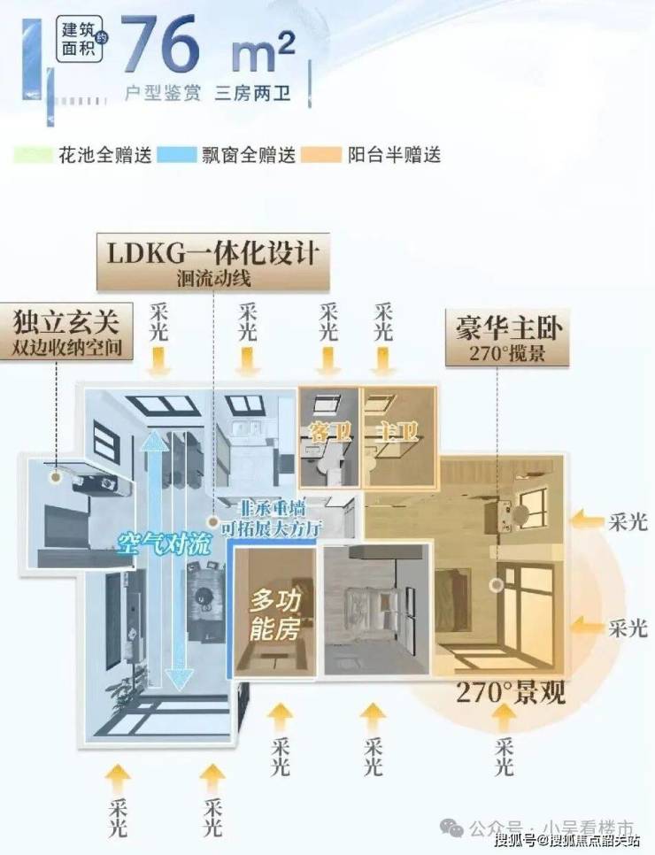建面76平三房两卫,使用率约120%,还有独立入户玄关,LDKG一体化设计,南北对流设计,主卧带270度景观。