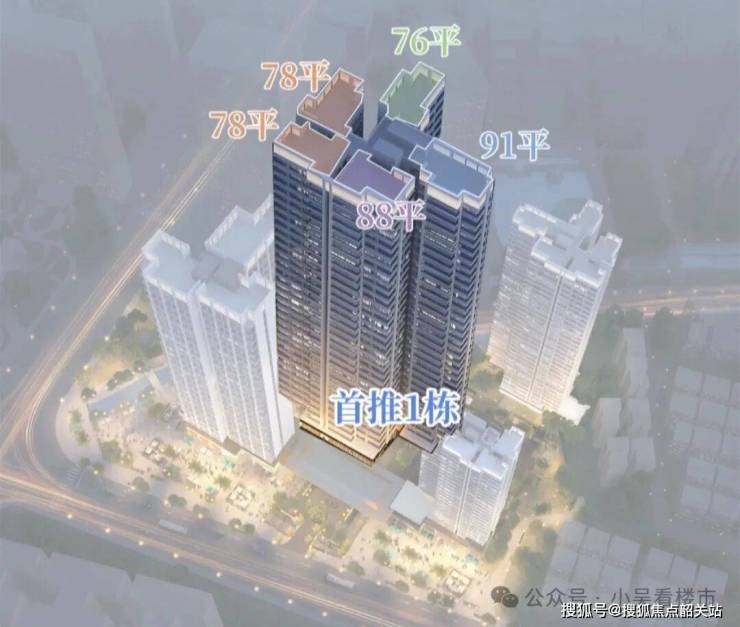 项目首推1号楼,更加远离主干道,1栋总共32层高,户型为建面76-78-88-91平三四房产品,户型图如下: