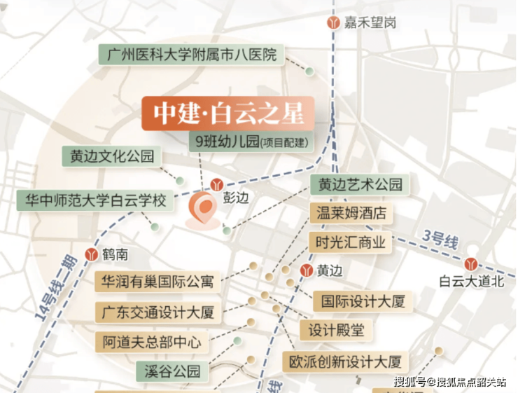中建·白云之星交通便利,享受四纵四横立体化轨道交通网络,距离2号线黄边站约800米,三站可达白云新城,直通江南西和广州南站;14号线二期鹤南站在建,距离约300米,实现快速直达火车站及主要交通枢纽。项目毗邻106国道、华南快速路及空港大道,便捷连接白云新城及珠江新城核心区域,自驾通勤高效。双地铁与多条城市干道相结合,使项目具备极高的通勤效率和区域联通性,为未来白云新城及设计之都发展提供强有力的交通支撑。