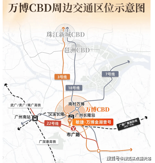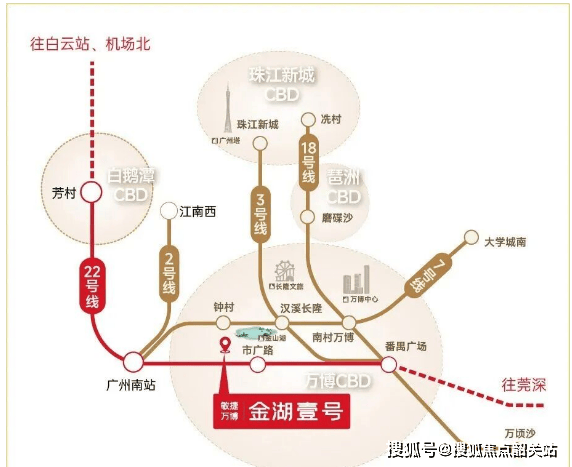 通过 22 号线出行,1 站即可抵达番禺广场,2 站直达万博 CBD 核心区,3 站通达琶洲 CBD,4 站抵达珠江新城,1 站直达广州南站,6 站可抵达白鹅潭 CBD。