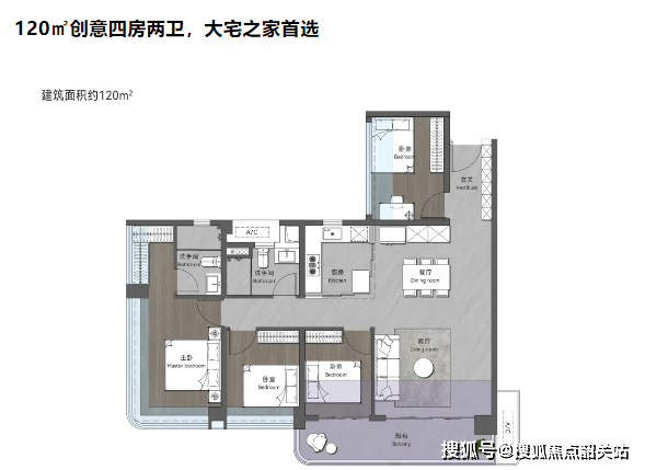 建面约 123㎡创意四房两卫户型,拥有约 15.9m 的奢阔采光面,采用南北通透的大开间设计,全屋无暗角,可时刻享受充足的阳光与室内鲜氧循环。