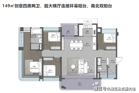 建面约 148㎡创意四房两卫户型,采用超大横厅设计,搭配环幕观景阳台与南北双阳台,玄关处预留了充足的收纳空间,既保障私密性,也实现空间高效利用。