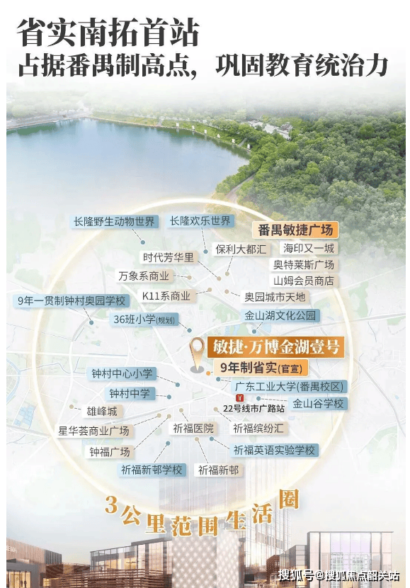 生态配套方面,项目紧邻番禺最大的湖泊公园 —— 金山湖文化公园,该公园原生体量约 108.7 万㎡,规模相当于珠江新城珠江公园的近 4 倍,生态资源得天独厚。