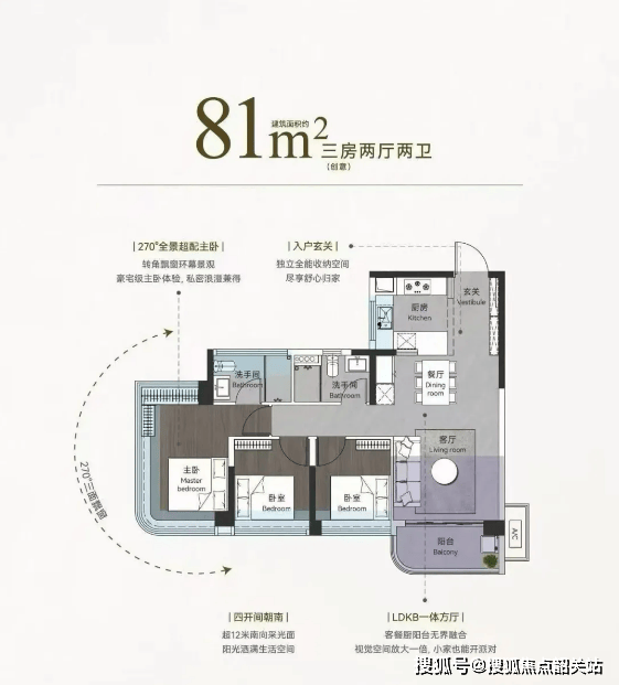 建面约 131㎡创意四房两厅户型,搭配环幕双景阳台,拥有 270° 环幕观景视野,可将社区园林与金山湖景观尽收眼底,打造沉浸式的观景居住体验。