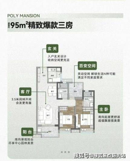 95㎡三房两卫:三开间朝南,主卧带L型飘窗,次卧灵活可变,双卫设计避免早晚高峰冲突,适合年轻家庭;