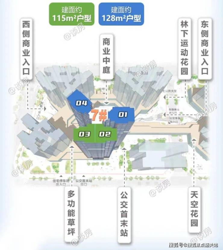 115-128㎡户型:楼王户型,四房两厅三卫,双套房设计,匹配塔尖人物的居住尺度。