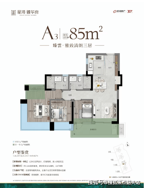 85平方米三房:分布在1号楼,客厅+三个卧室朝南,南北对流设计。