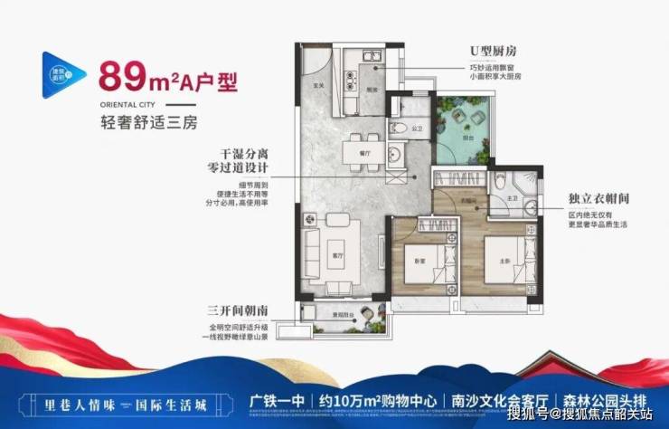 89㎡2+1房两厅两卫:明星户型,空间更为宽敞开阔。零过道设计,主套带衣帽间,全南向观景阳台。三开间朝南,大山乸森林景观。U型餐厨空间流畅宽敞,满足家庭烹饪需求。南北通透,清风婉转。