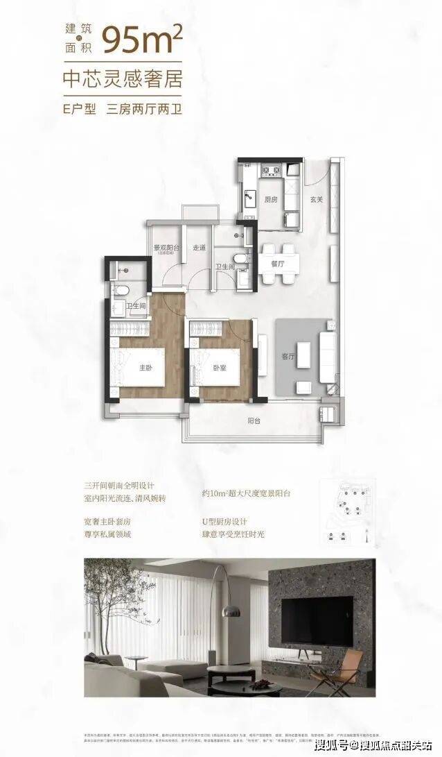 空间布局:户型方正,动静分区合理,客厅与餐厅相连,形成开阔的公共活动区域,连接超10米宽幕大阳台,增加采光与通风,提升空间通透感。