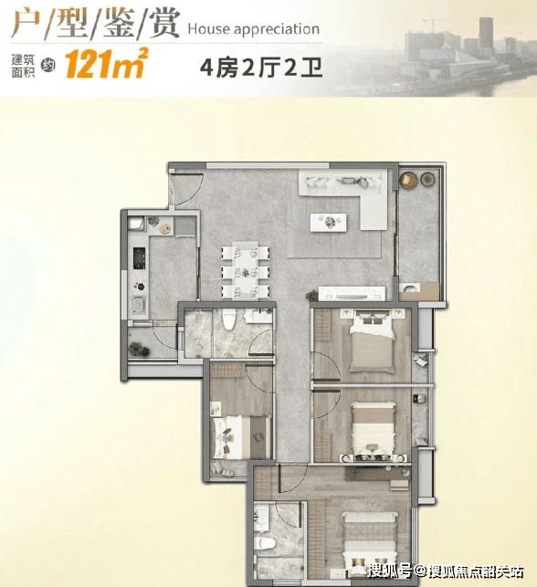 建面约121㎡天幕四房:东南朝向,四房朝阳,每间房都能享受江幕与阳光共舞的美好。