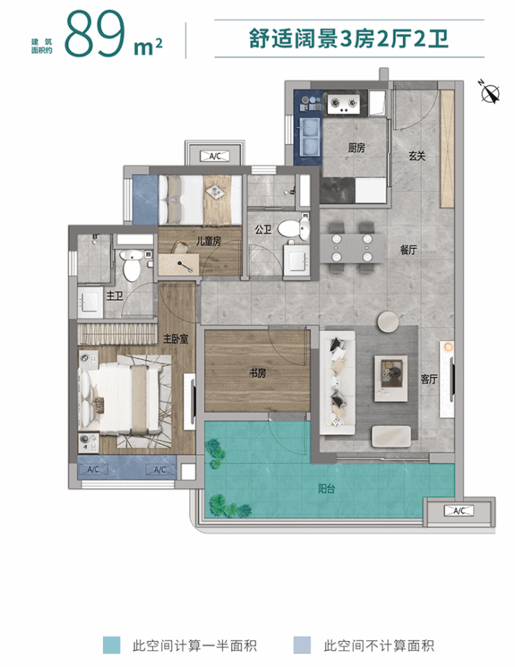 85平方三房实用率超高,飞机户型,三开间朝阳,主卧带270°转角飘窗,景观视野一流。