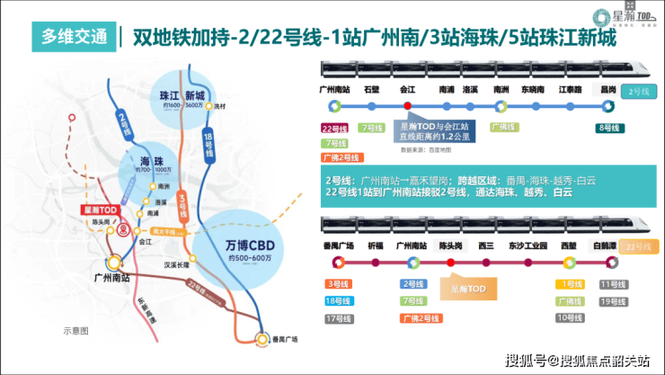 2、从地理位置上看,越秀·星瀚TOD占据着得天独厚的优势。目前距离2号线地铁会江站约1.8公里,同时是在建22号线地铁陈头岗站上盖项目。这种双地铁的布局,极大地提升了居民的出行便利性。通过22号线,1站就能抵达广州南站,畅享大湾区生活,无缝对接区域内各大城市,无论是商务出行还是旅游探亲,都能高效便捷地实现。不仅如此,项目紧邻南站新城商务区,东邻万博CBD,两大CBD的加速兑现,为区域带来了无限的发展潜力时,它距离珠江新城直线距离约11.7KM,南近南站新城,东临万博CBD,西靠广钢广船,北望珠江新城CBD,尽享四大主城繁华,被五大商圈覆盖,真正实现了繁华都市生活的全方位触达。