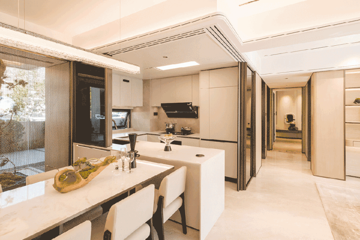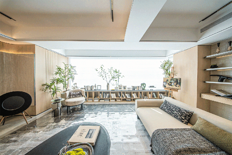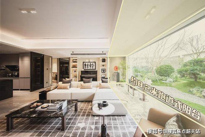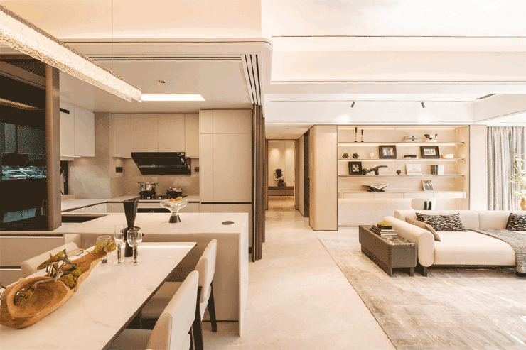 客厅尺度阔绰,与超 6.4 米南向阳台连通,不仅营造出奢阔的空间感,还保证了充足采光与通风。在这里,家人可以尽情享受温馨的家庭时光,或邀请朋友聚会畅谈。