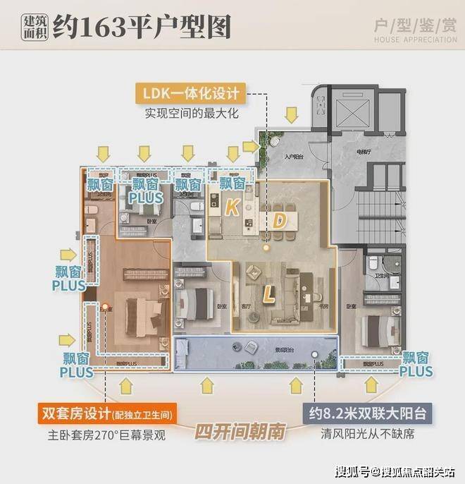 建面约 163㎡的户型,实力诠释 “人居进化” 理念。约 8.8㎡超大入户花园,开间达约 3.55 米,相当于普通客厅尺度,L 型采光窗引入充足光线,功能多样,可打造为婴儿车停放区、大容量收纳空间、四季花园或品茶小景,满足家庭不同需求。