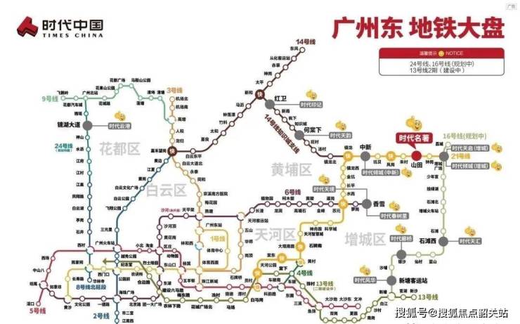 从山田站出发,快线5站到天河,接驳 14号线知识城支线及16、27号线(规划中),可无缝衔接白云、新塘等区域。