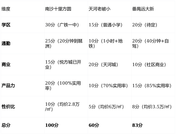 → 竞品A:学区未定,实用率85%;竞品B:商业未开业,容积率4.0。南沙十里方圆综合优势更明显。