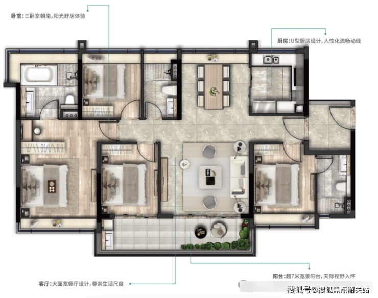 建面 140㎡的四室两厅三卫户型,方正宽奢布局,巨幕观景阳台,双套间大面宽,四开间朝南,超 7 米宽景阳台带来广阔视野 。