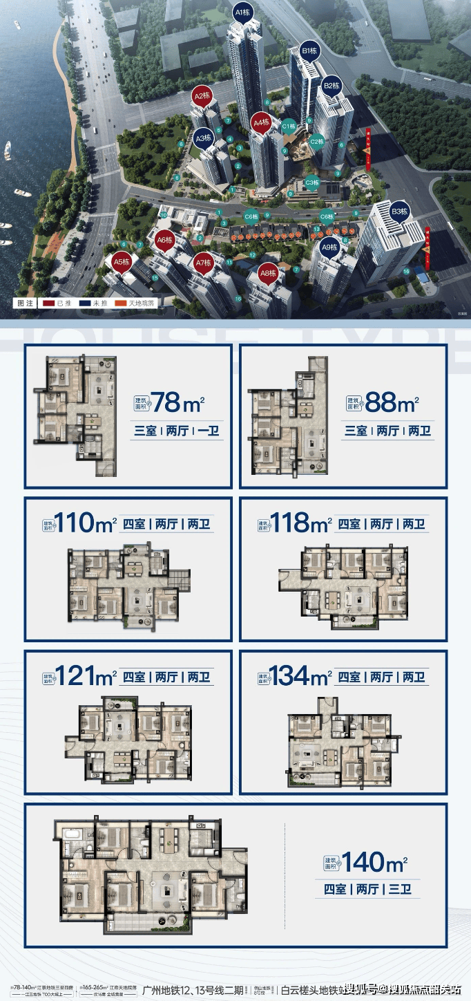 整个槎头站TOD项目一共分为三期开发,其中一期的五矿招商江天际是由五矿地产、招商蛇口和广州地铁三大开发商携手合作打造,一共有12栋,其中9栋17-33层住宅,3栋公寓,总规划户数大约是1407户